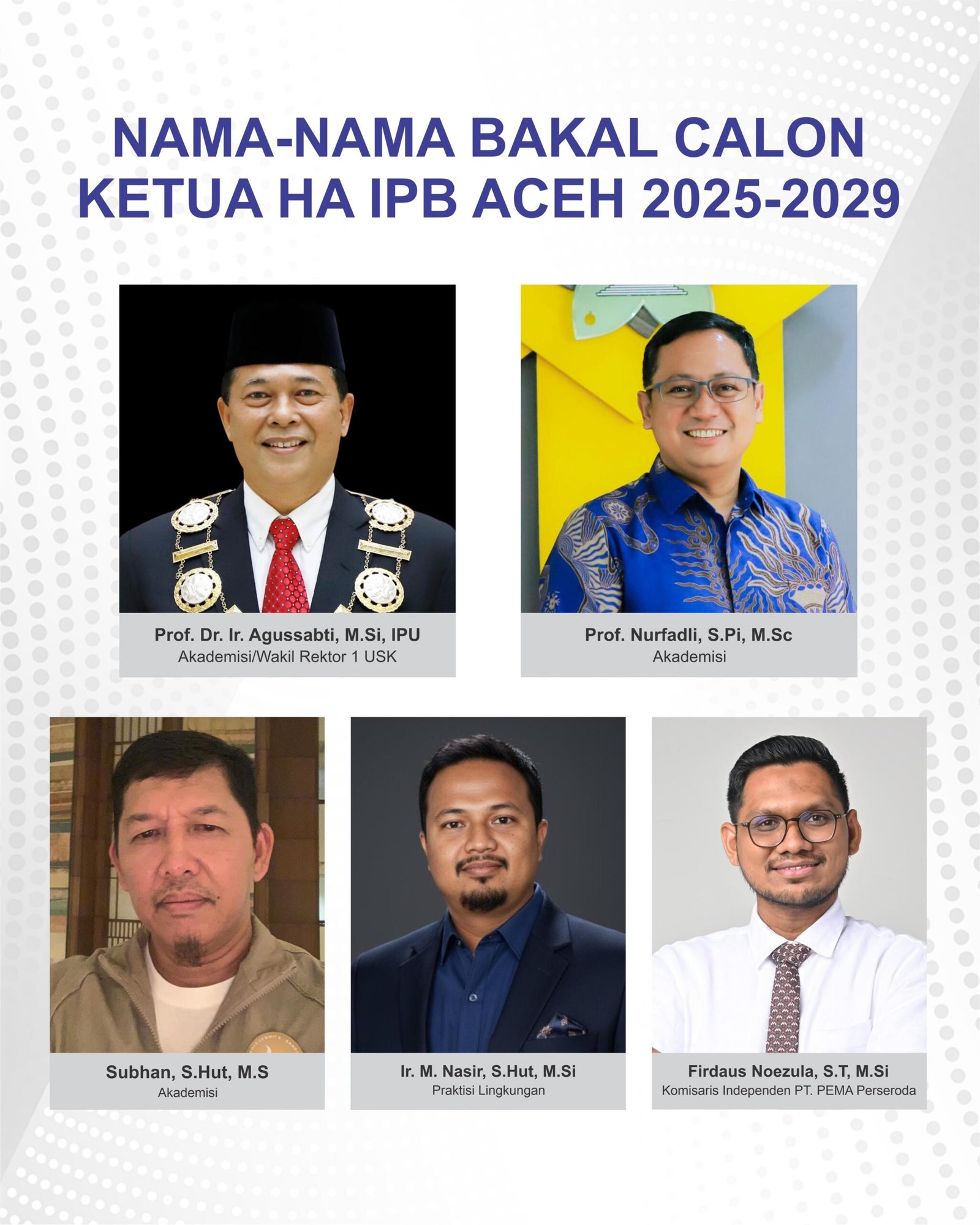 Adapun lima nama yang masuk nominasi bakal calon Ketua HA IPB Wilayah Aceh adalah: