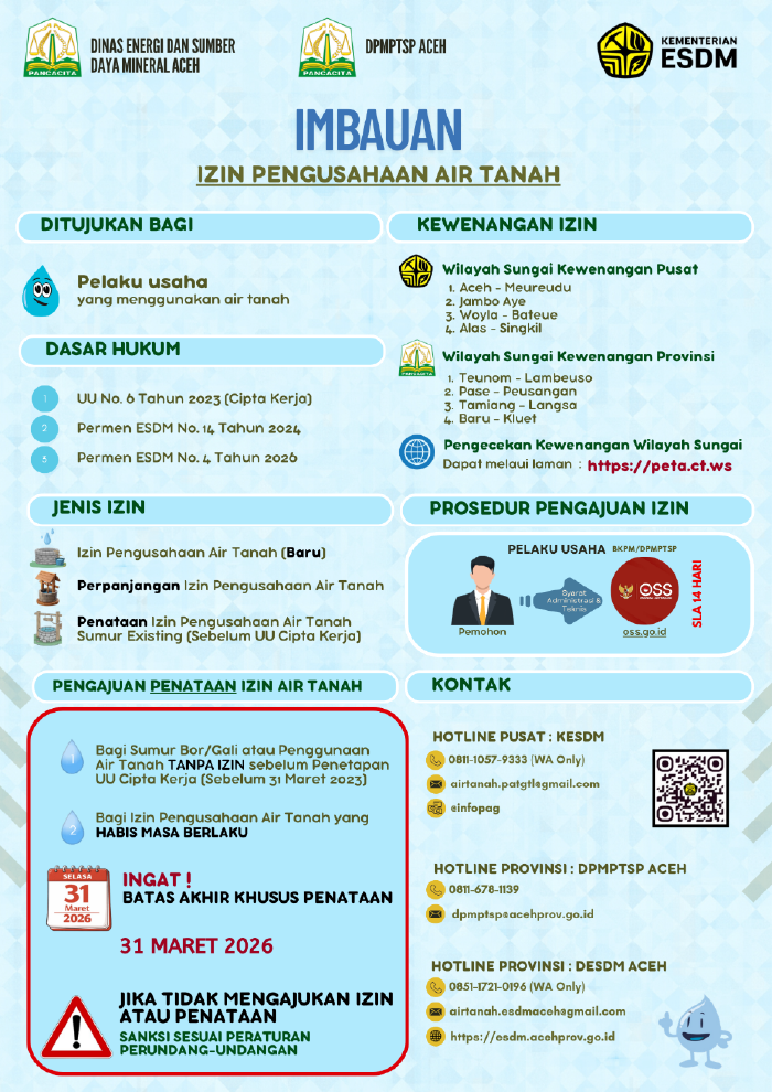 Pemerintah Aceh berkomitmen memberikan pendampingan dan kemudahan akses informasi bagi pelaku usaha yang ingin berkonsultasi. Layanan informasi dapat dihubungi melalui hotline Dinas ESDM Aceh di nomor 0851‑1721‑0196 (khusus WhatsApp) atau 0811‑678‑1139, serta email airtanah.esdmaceh@gmail.com. Informasi lebih lanjut tersedia di situs esdm.acehprov.go.id atau dpmptspacehprov.go.id.