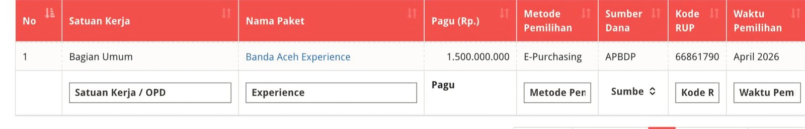 Dikelola oleh Bagian Umum Setdako Banda Aceh, paket ini memiliki pagu anggaran sebesar Rp 1.500.000.000 (Rp 1,5 miliar). Metode pengadaan menggunakan E-Purchasing dengan sumber dana APBDP, Kode RUP 66861790, dijadwalkan April 2026.