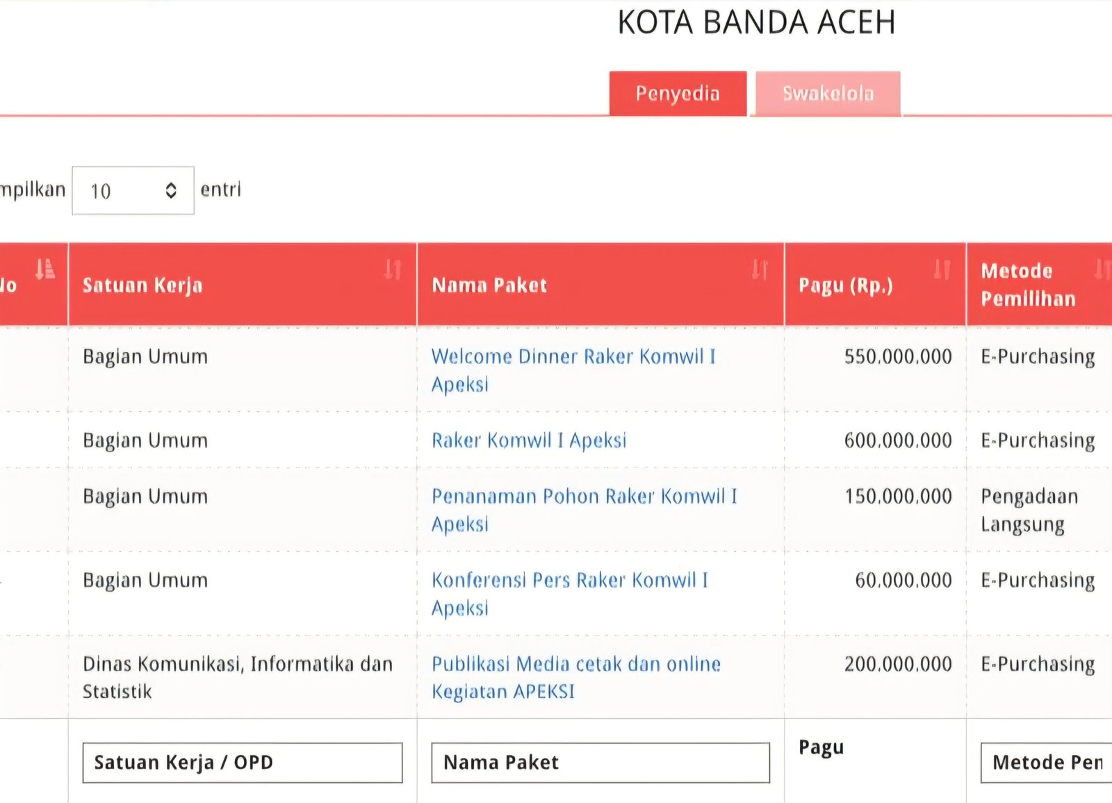 Dari delapan paket yang teridentifikasi, enam di antaranya dikelola oleh Bagian Umum Sekretariat Daerah Kota Banda Aceh, menjadikan unit kerja tersebut sebagai pengelola anggaran terbesar dalam rangkaian acara ini dengan total mendekati Rp 3,6 miliar dari total yang terkonfirmasi.