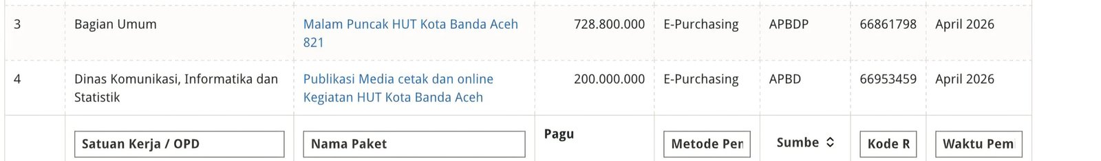 BANDA ACEH — Perayaan Hari Ulang Tahun Kota Banda Aceh ke-821 yang berlangsung selama empat hari ternyata menyedot anggaran daerah hingga mendekati angka Rp 4 miliar, berdasarkan data Sistem Informasi Rencana Umum Pengadaan (SIRUP) Lembaga Kebijakan Pengadaan Barang/Jasa Pemerintah (LKPP) tahun anggaran 2026 yang berhasil dihimpun redaksi.