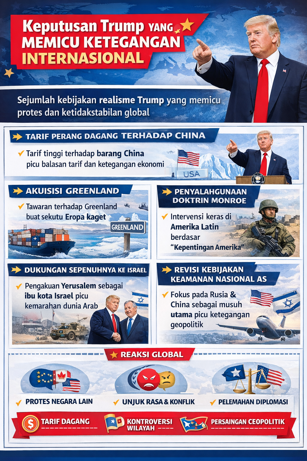 Trump bahkan tidak mau diatur oleh settingan aliansi dunia warisan pendahulunya hasil Perang Dunia ke II. Baru kali ini negara Eropa dan anggota NATO yang ibarat sekutu abadi AS, seperti Denmark, merasa terancam dengan kebijakan luar negerinya.