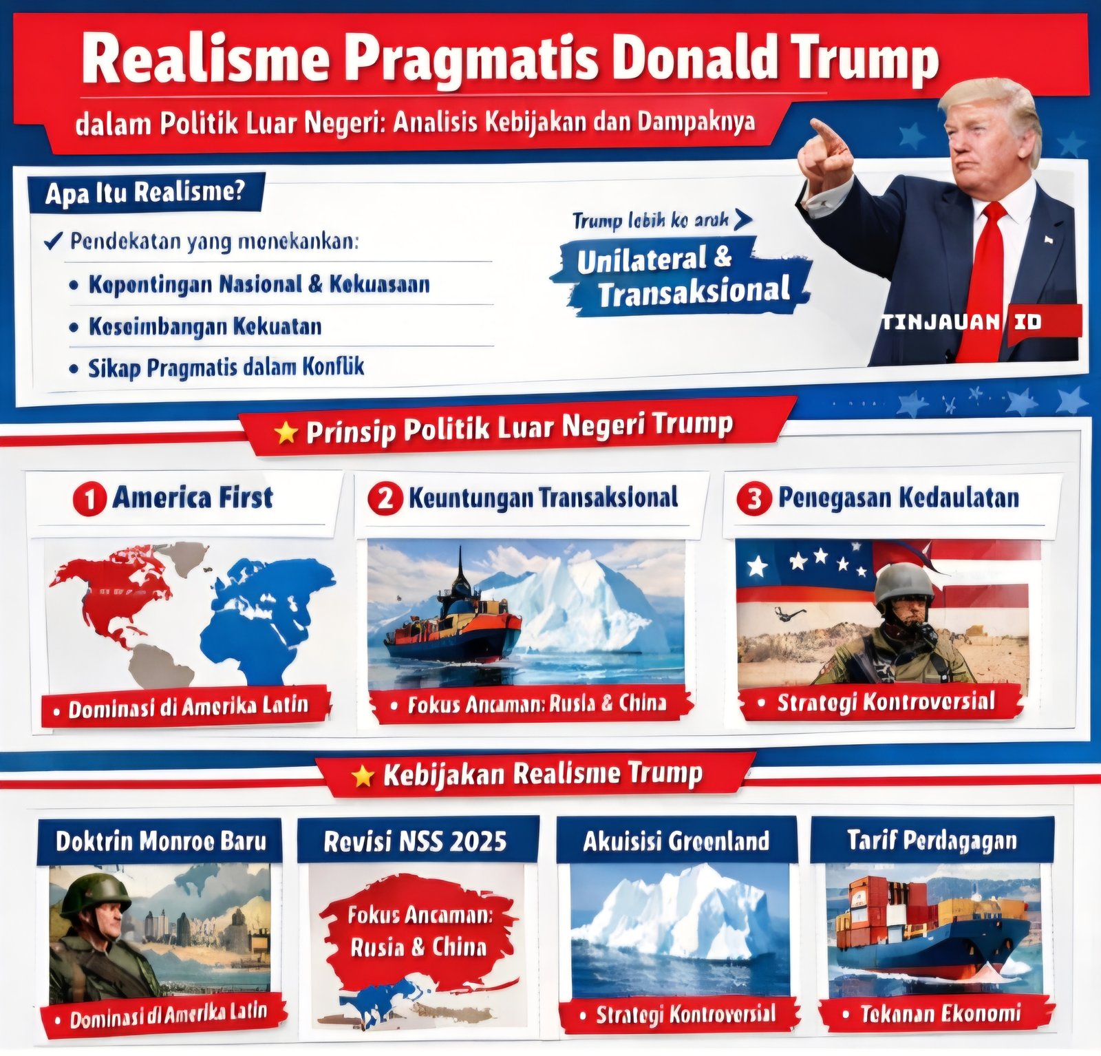 Trump menampilkan mazhab realisme dalam kebijakannya. Realisme yang sangat pragmatis. Baginya yang penting adalah apa yang menguntungkan kami, cerminan dari kebijakan luar negerinya yang tertuang dalam slogan: America First.