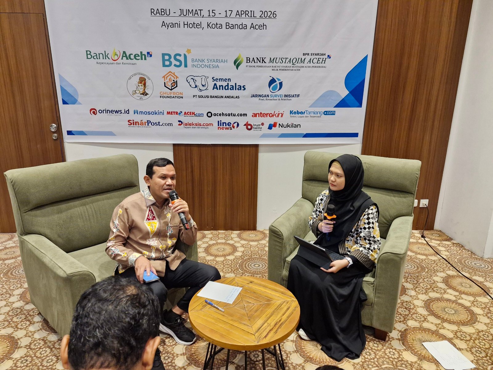 Wakil Gubernur Aceh Fadhlullah menjelaskan tentang pemulihan bencana banjir Aceh 2025 di Hotel Ayani, Kamis, (16/4/2026) di Banda Aceh. Foto: Jabal/tinjauan.id
