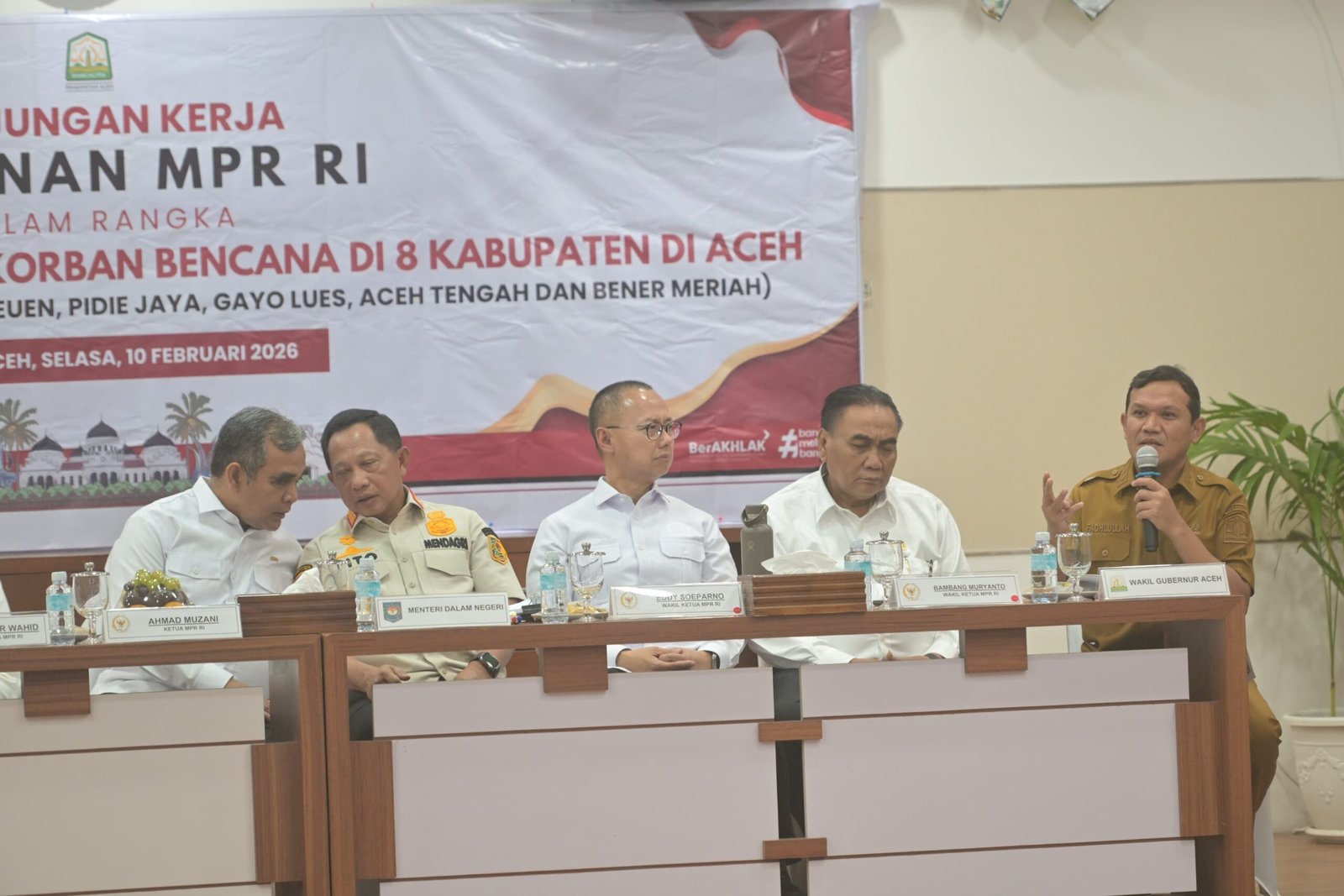 Banda Aceh — Wakil Gubernur Aceh Fadhlullah meminta percepatan penyaluran berbagai bantuan dan program pemulihan bagi korban banjir dan longsor saat menerima kunjungan pimpinan dan anggota MPR RI di Kantor Gubernur Aceh, Selasa (10/2/2026).