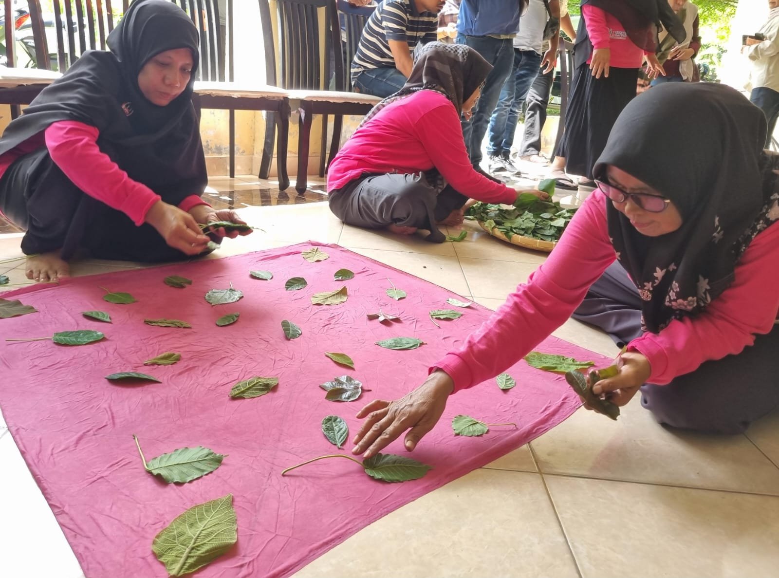 SABANG – Ibu-ibu tampak sibuk menempelkan daun-daunan dan bunga-bungaan di atas bentangan kain. Di teras rumah produksi sederhana itu, warna-warni alam berpadu dalam harmoni yang indah.