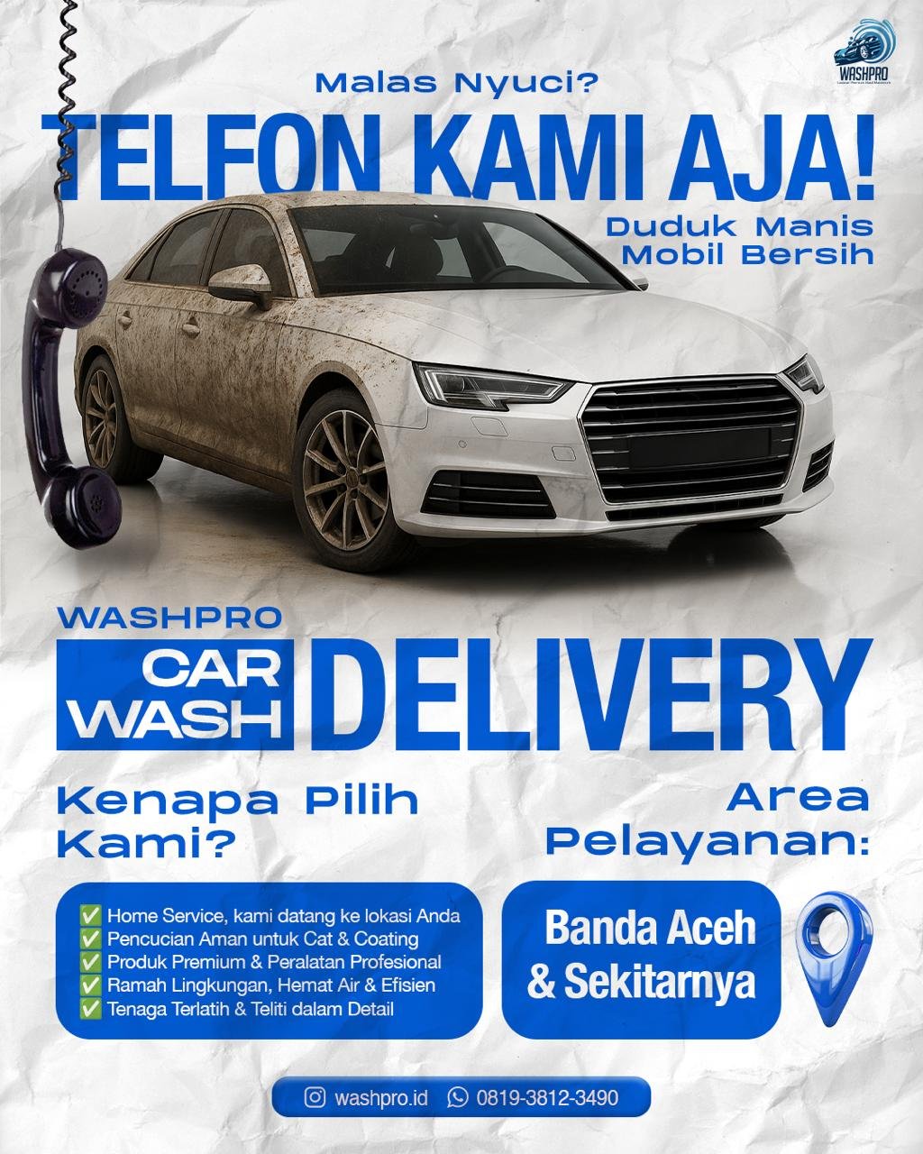 Banda Aceh – Washpro hadir dengan layanan Car Wash Delivery. Tim dari Washpro bisa dipanggil untuk datang ke rumahmu. Cukup telpon, tim profesional Washpro langsung ke lokasi kamu.